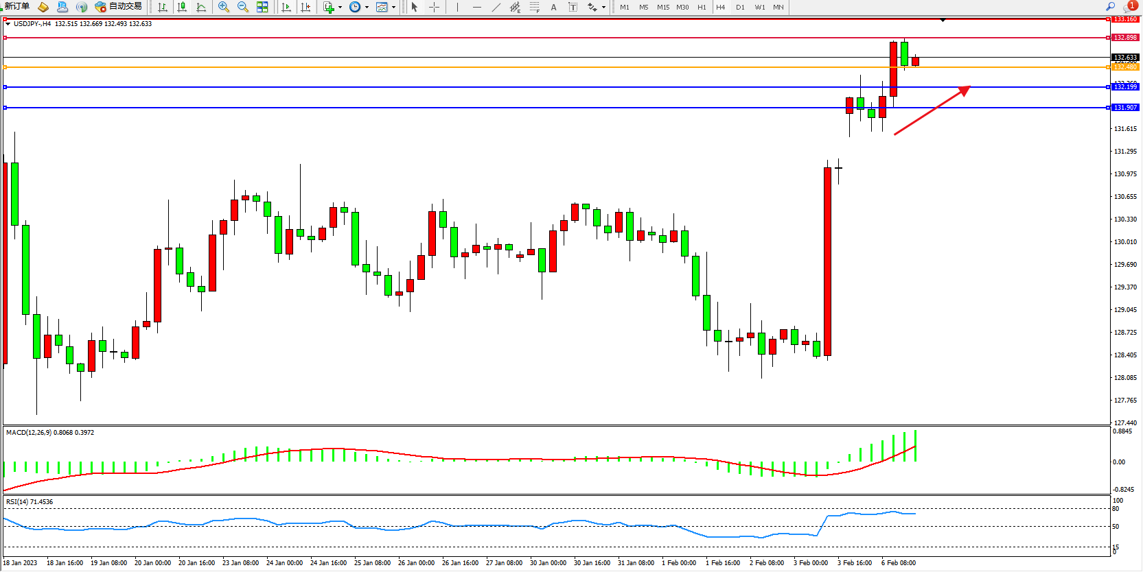 4小时图看:多头动力急速拉升后,高位震荡上移,短期看涨情绪依旧,市场多头动力不断攀升中,MACD指标处于多头区域不断上扬,RSI指标处于多头区域高位徘徊;
