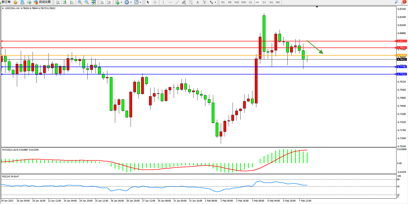 交易策略:6.78787下方看跌,目标6.77706、6.77015