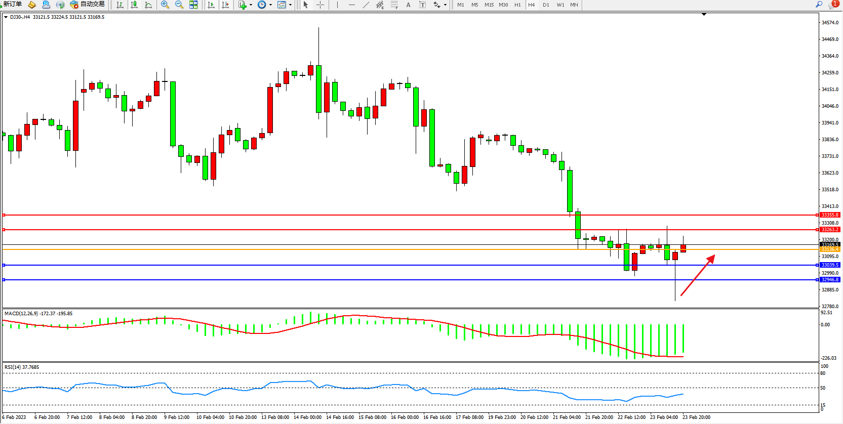 道琼斯指数2月23日(周四)收盘上涨111.19点,涨幅0.34%,报33156.28点;美国经济的增速略有放缓,主要原因是消费者削减了支出。作为经济的主要引擎,消费支出的年增长率为1.4%,而不是最初公布的2.1%。