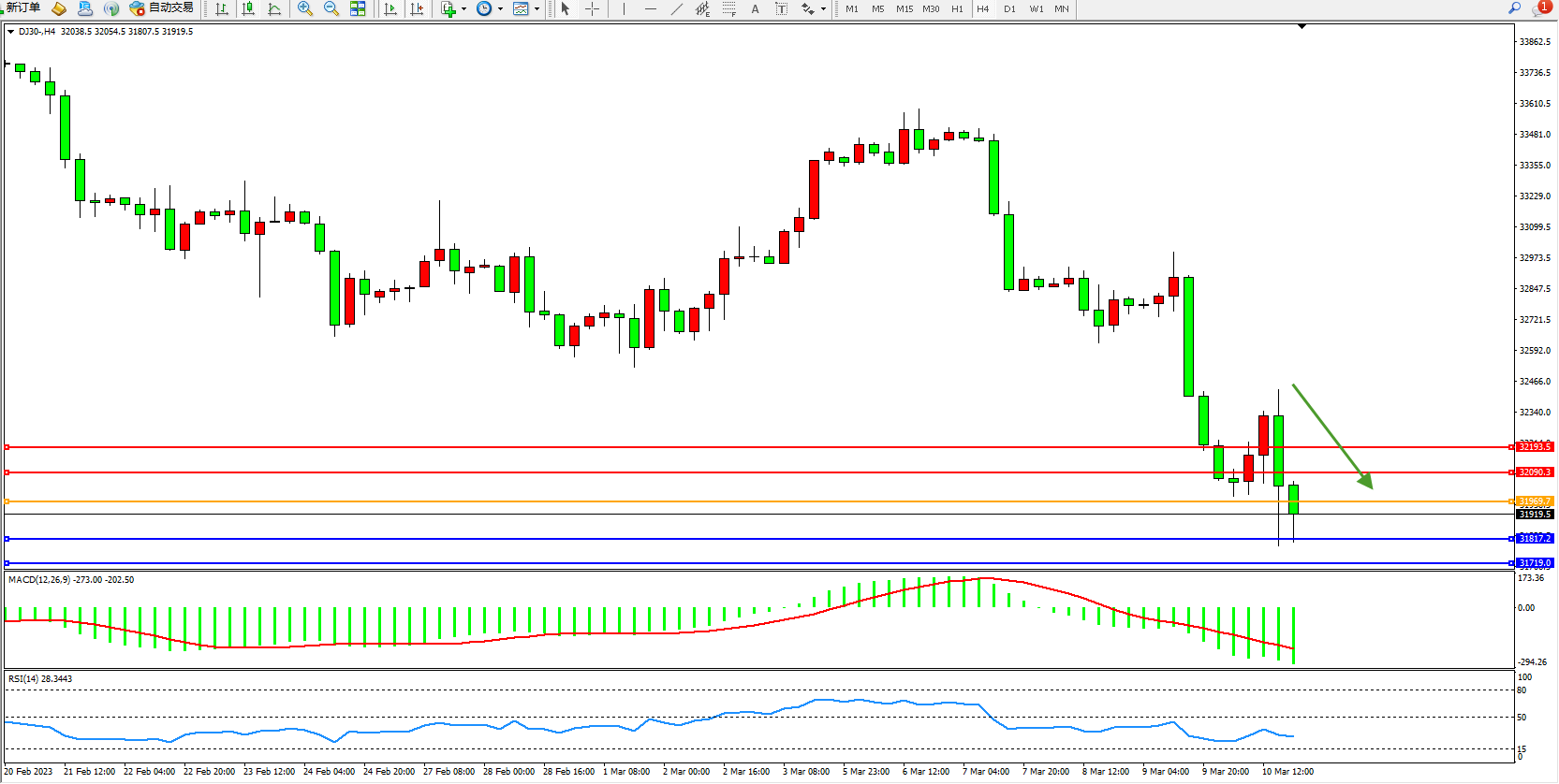 道琼斯指数3月10日(周五)收盘下跌542.35点,跌幅1.65%,报32256.05点;美国2月失业率 3.6%,预期3.40%,前值3.40%。美国2月季调后非农就业人口 31.1万人,预期20.5万人,前值51.7万人。