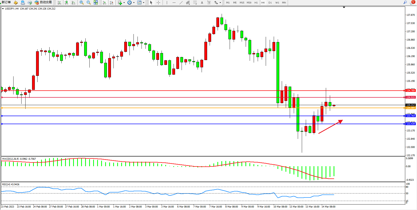 交易策略:134.089上方看涨,目标134.515  134.789