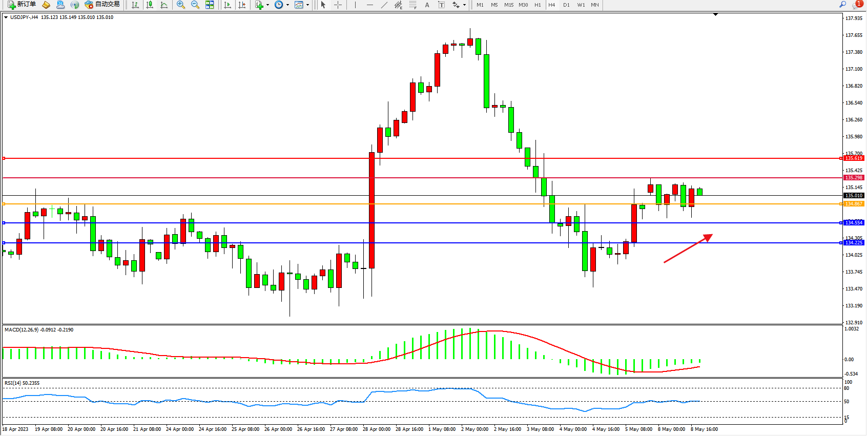 美元兑日圆维持135.010附近震荡,日本黄金周假期被压抑的需求,鉴于美国银行业、债务上限和地缘政治的担忧,市场持谨慎态度。美元/日元受美国利率峰值臆测和美联储淡化降息预期的拉锯。