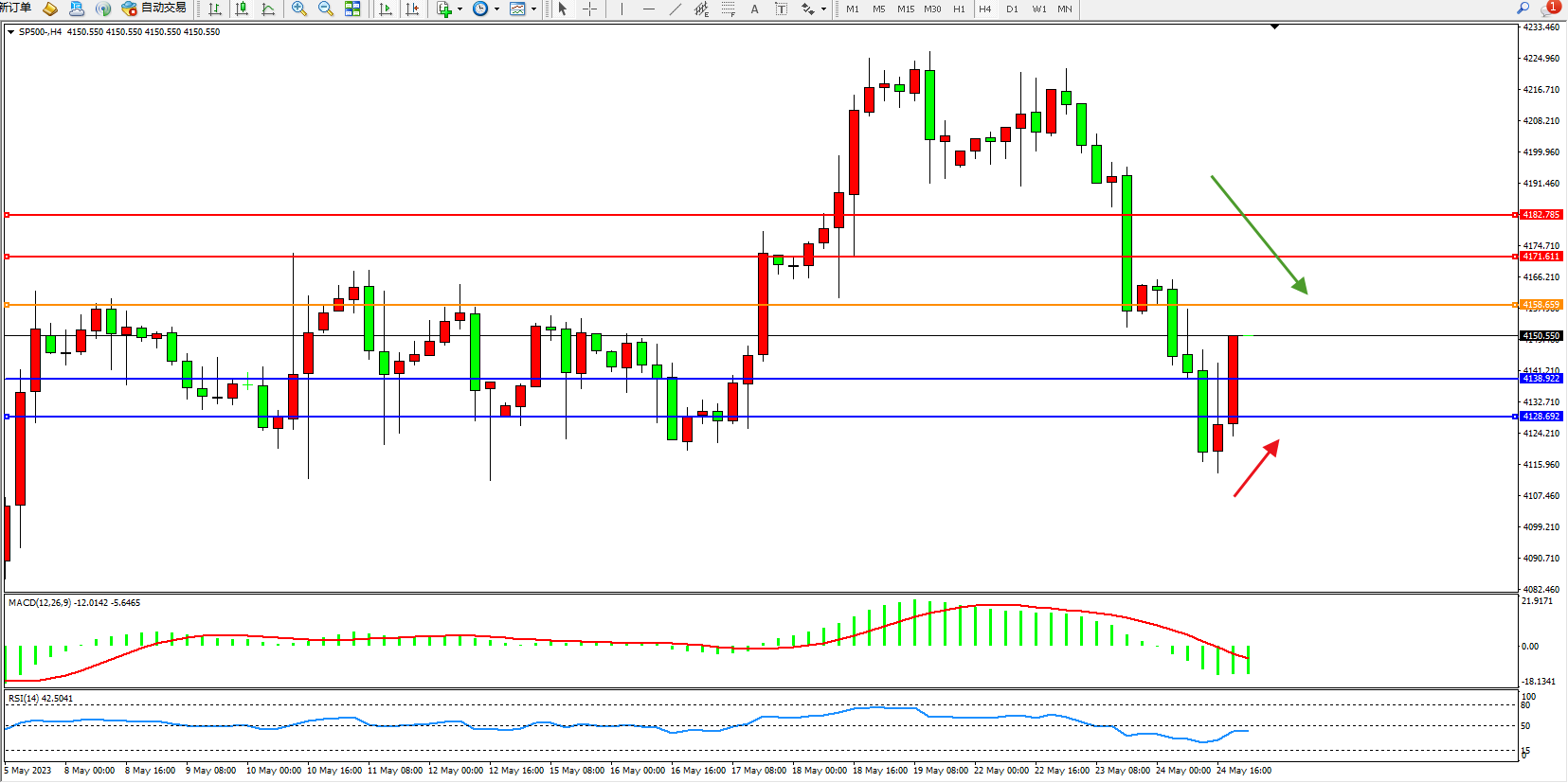 标普500指数5月24日(周三)收盘下跌29.98点,跌幅0.72%,报4115.60点;随着距离提高政府31.4万亿美元借款限额的最后期限越来越近,美国总统拜登和国会共和党人的代表周二(5月23日)结束了新一轮债务上限谈判,但依然未能达成任何决议。