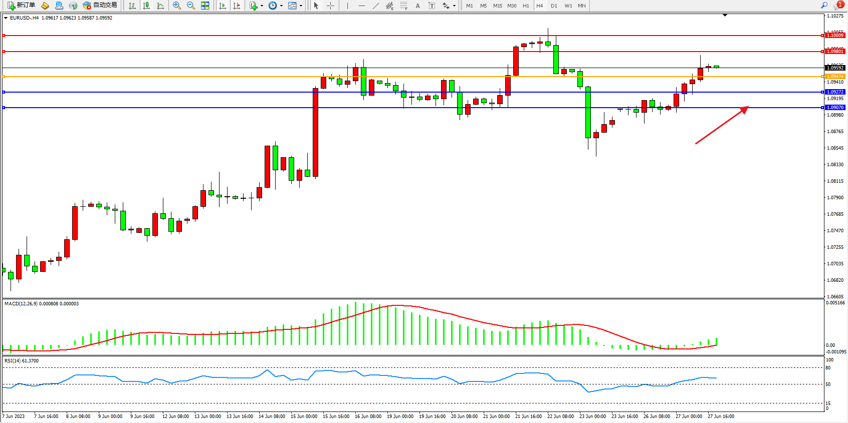 欧元美元EURUSD—4小时K线图显示: