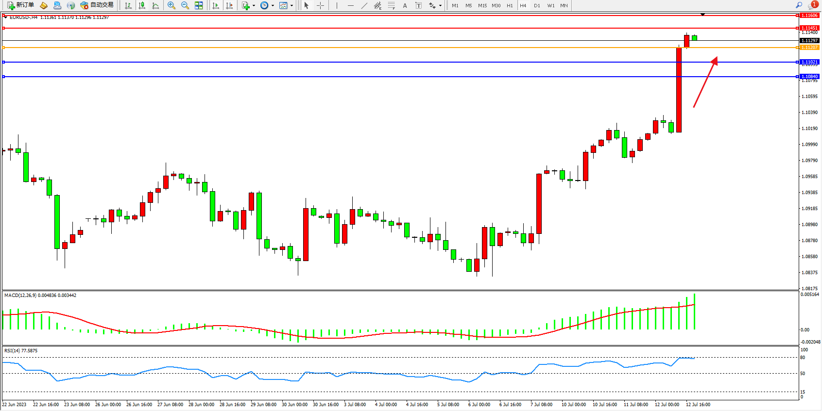 欧元美元EURUSD—4小时K线图显示: