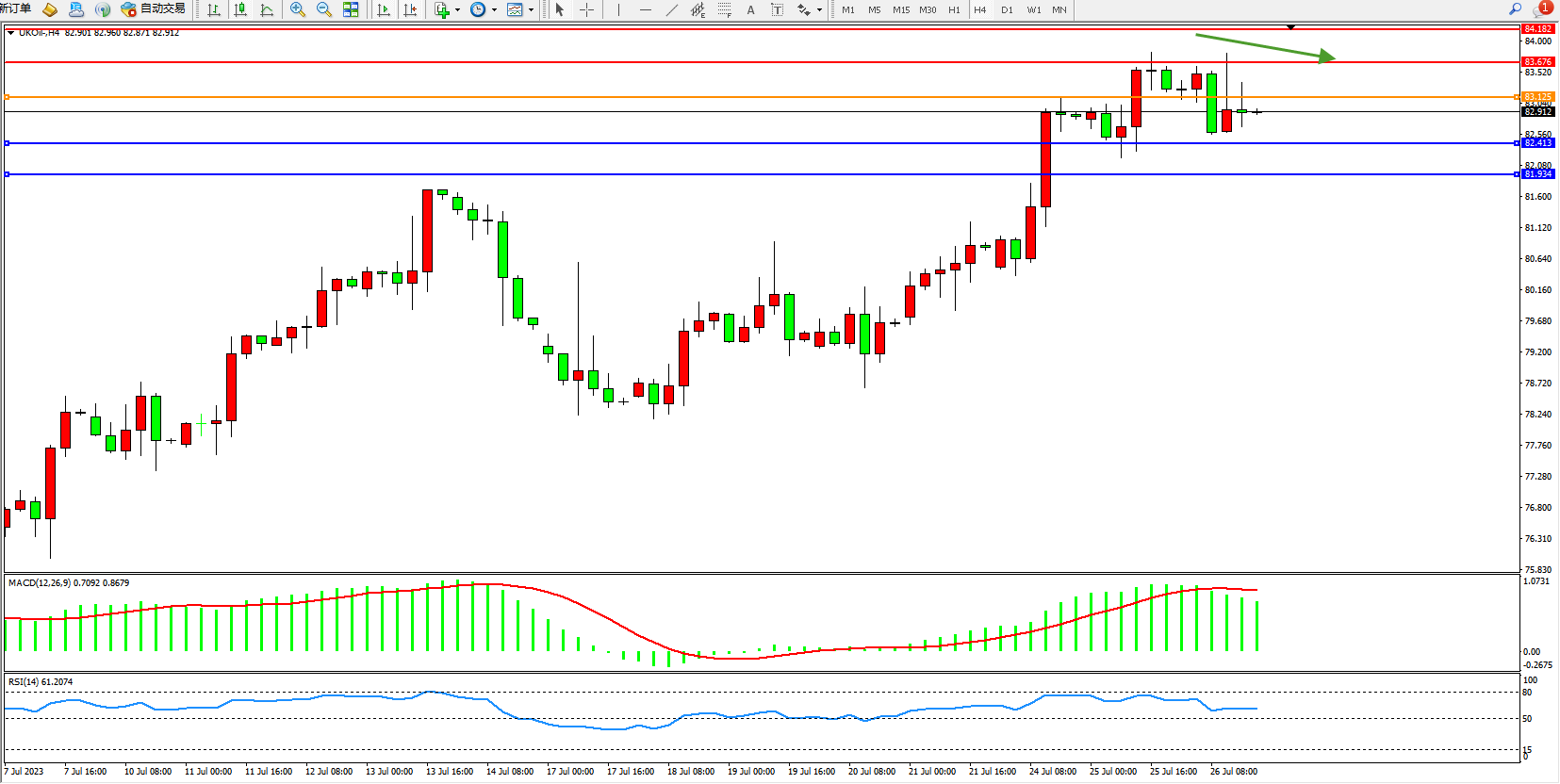 4小时图看:高位短期上扬后遇阻整理,市场空头情绪逐渐涌现,短期有继续回撤迹象,MACD指标处于多头区域平缓下行,RSI指标处于多头区域维持整理;