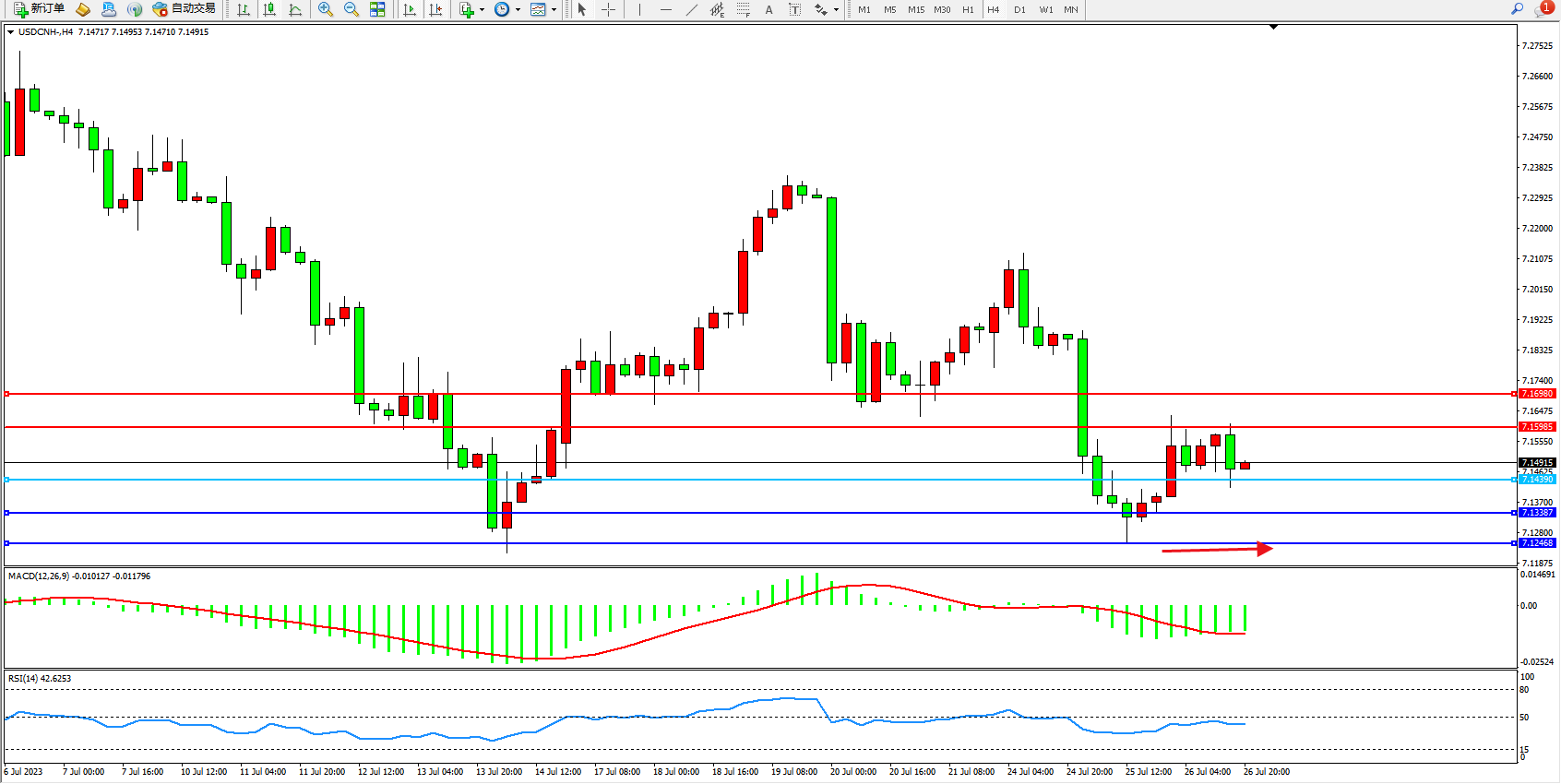 备选策略:7.14390下方看跌,目标7.13387  7.12468