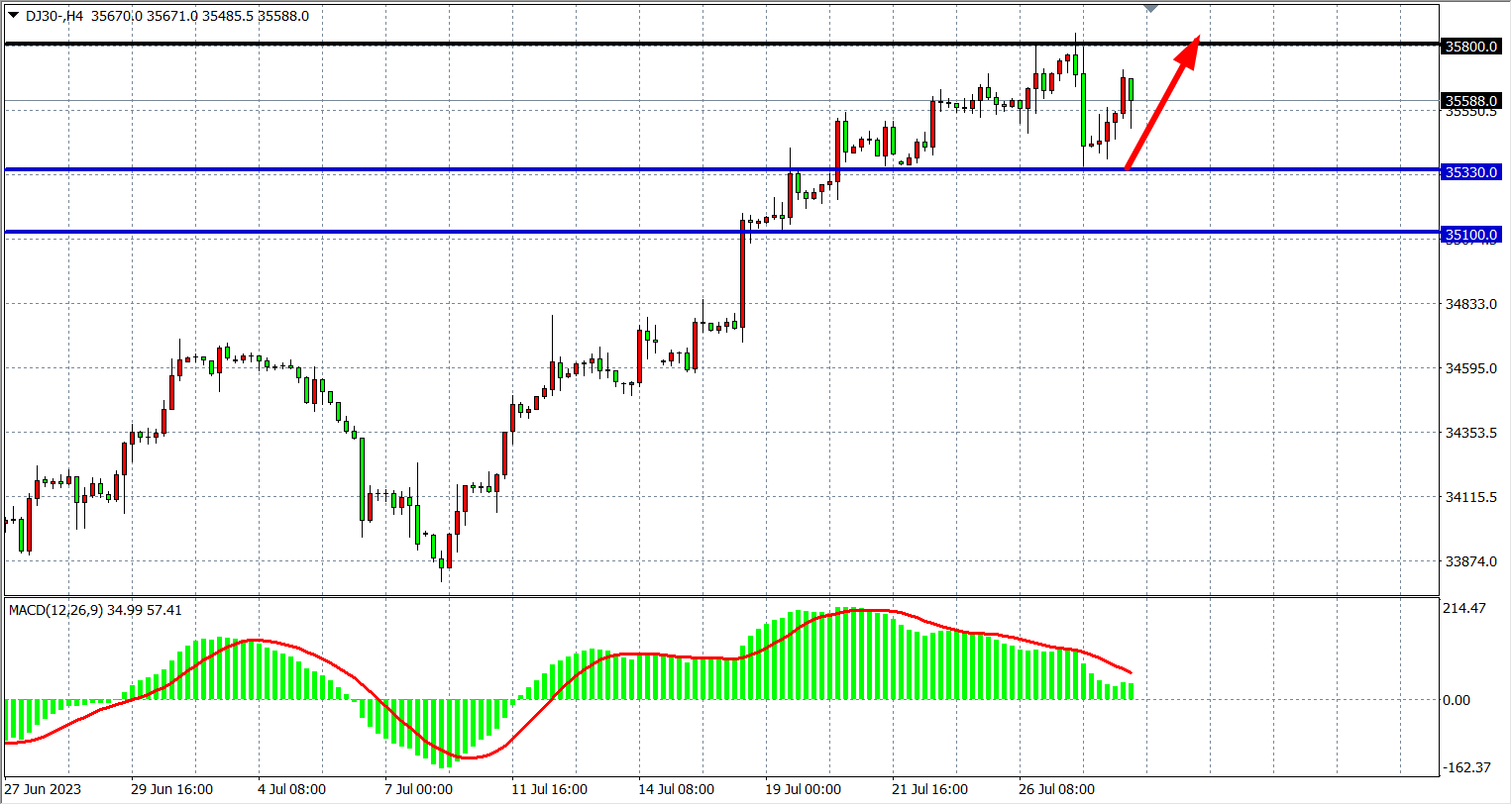 4小时图看,道指在高位35800附近徘徊,MACD量能在零轴上维持较大量能,趋势仍维持上行,支撑关注35330-35100附近,阻力35520-36000。