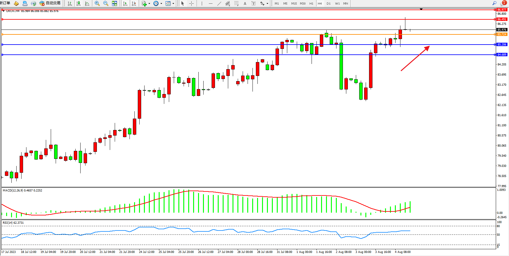 4小时图看:高位多头动力持续震荡上行,市场多头情绪笼罩,MACD指标处于多头区域整理向上移动,RSI指标处于多头区域整理;