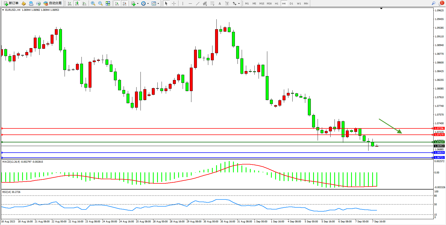 欧元美元EURUSD—4小时K线图显示: