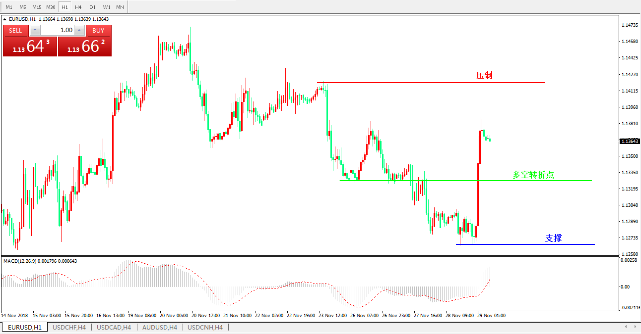 技术面简析:H1周期显示,汇价强势击穿下行趋势线,MACD上穿0轴,动能柱开始放量,有望延续升势。
