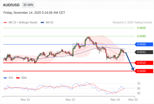 在 0.6560 之下,看跌,目标价位为 0.6515 ,然后为 0.6495 。