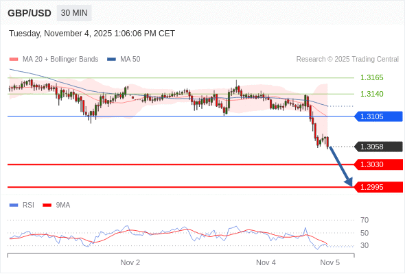 在 1.3105 之下,看跌,目标价位为 1.3030 ,然后为 1.2995 。