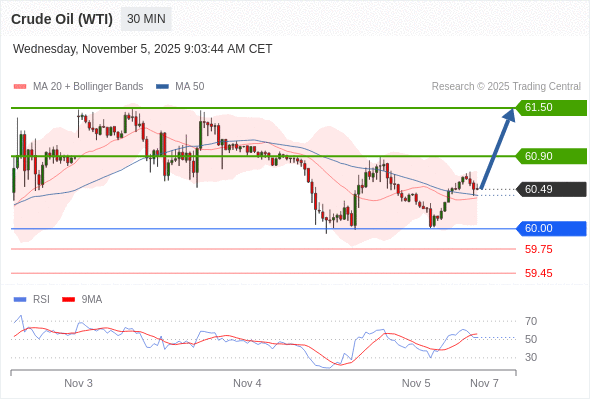 在 60.00 之上,看涨,目标价位为 60.90 ,然后为 61.50 。