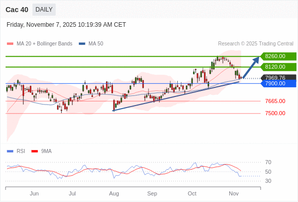 Cac 40 短线: 被上升趋势线支撑。