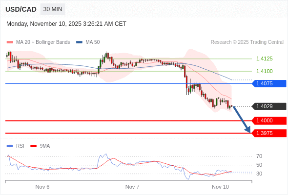 在 1.4075 之下,看跌,目标价位为 1.4000 ,然后为 1.3975 。