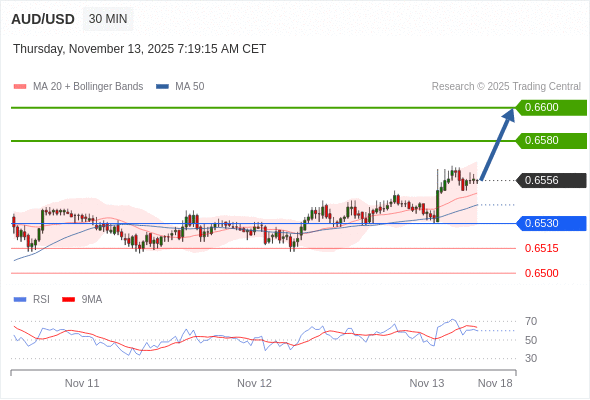 在 0.6530 之上,看涨,目标价位为 0.6580 ,然后为 0.6600 。