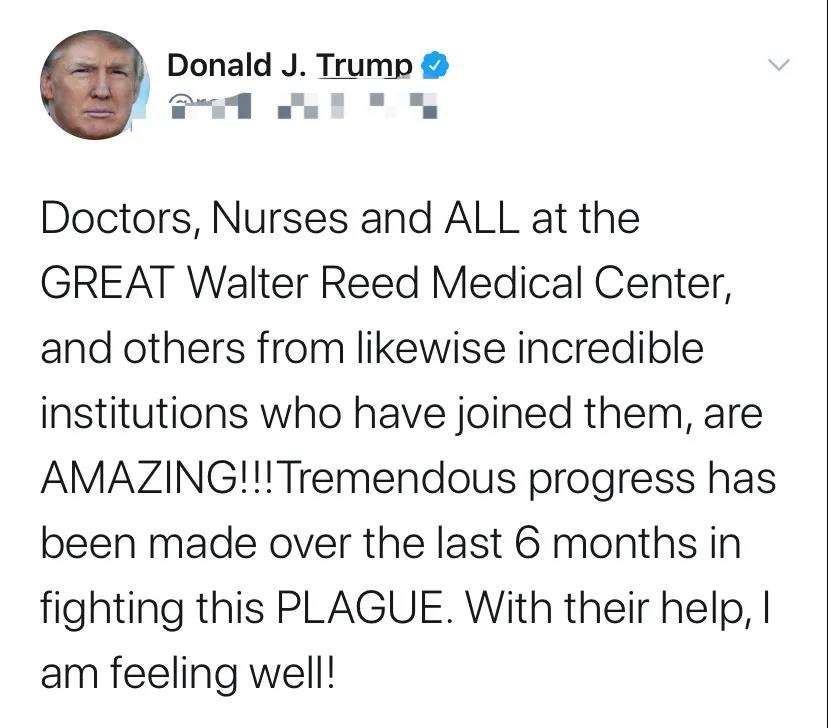 10月3号傍晚7点,特朗普发布了感染新冠后的第二支视频:我很好!虽然昨天我住院前感觉不是很好,但是现在好很多了。特朗普还开了个玩笑:梅拉尼娅也很好,你们知道她比我年轻一些,但只是一些些哦。