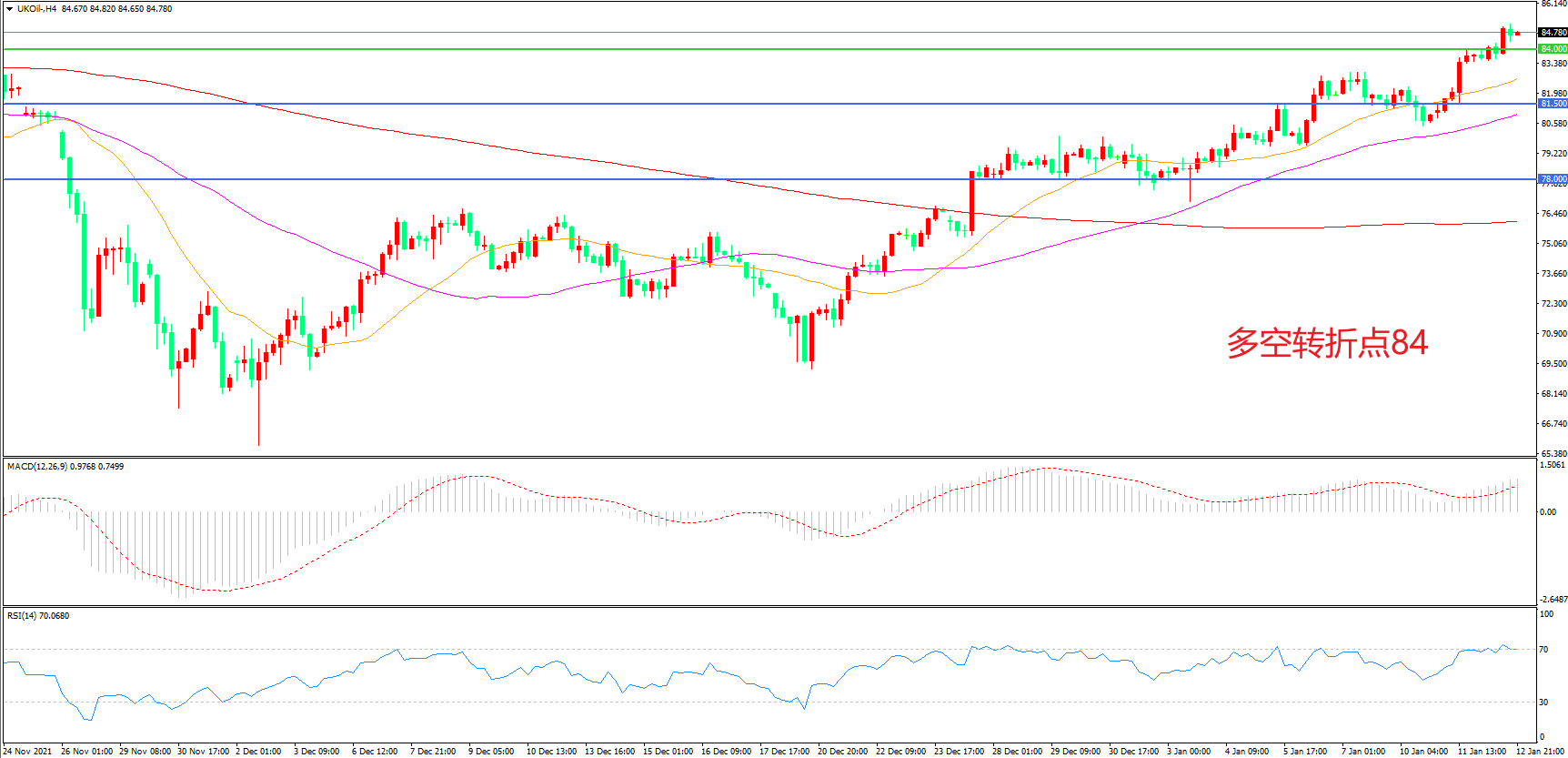 4小时图看,油价长阳拉升,突破前期整理区间,整体表现偏强,84成为多空分水岭,MACD红柱增加,RSI指标走平,日内震荡上行概率较大。