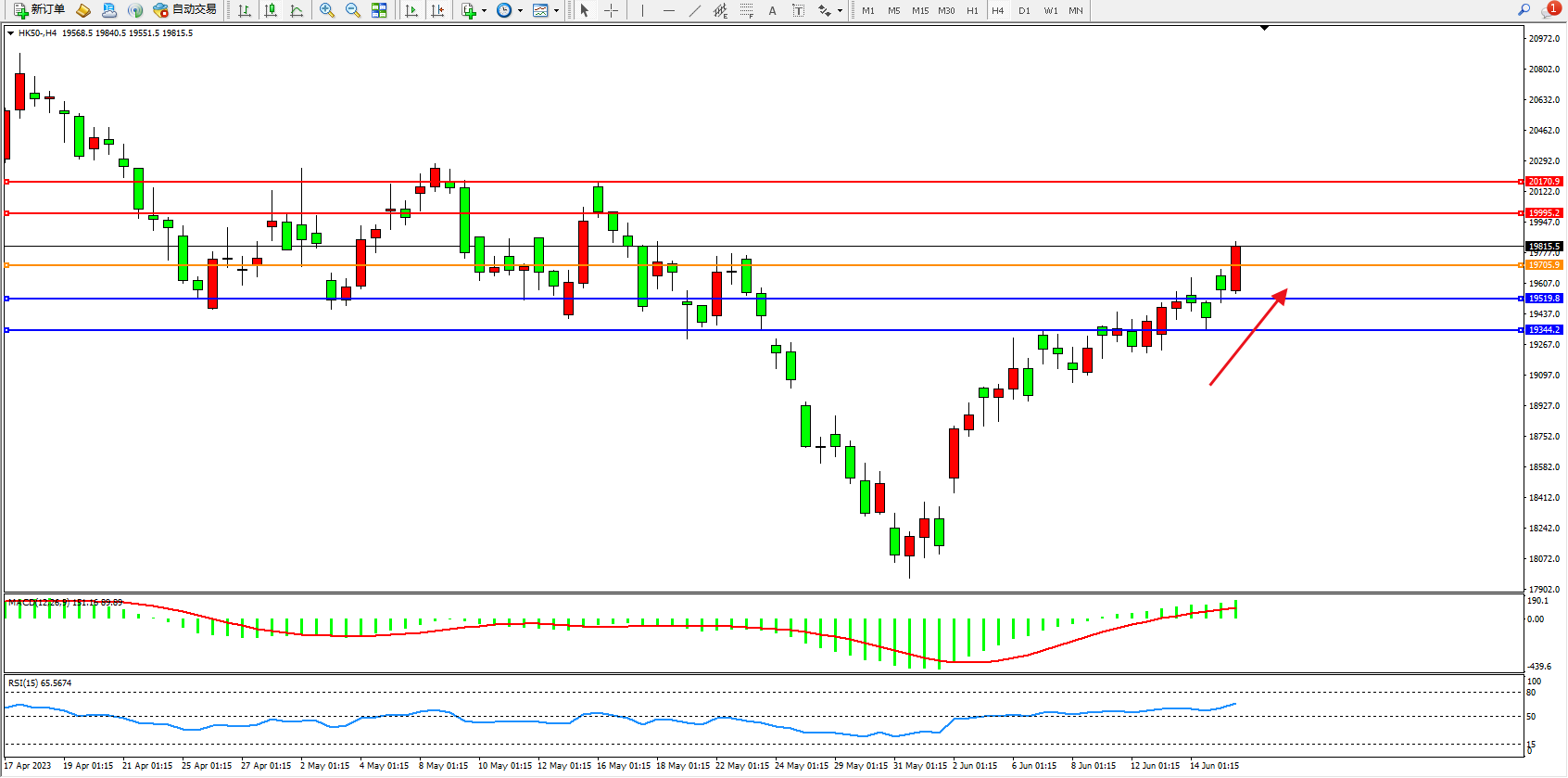 香港恒生指数6月15日(周四)收盘上涨420.5点,涨幅2.17%,报19828.92点;美联储按下“暂停键”叠加布林肯将访华,风险市场情绪尤为高涨。港股三大指数午后大幅上扬,恒生科技指数涨3.59%表现最佳,恒指、国指分别上涨2.17%和2.98%,恒指大涨420点有望重回2万关口。大型科技股强势助力大市走俏,美团劲升近8%,京东涨超5%,商务部新闻发言人束珏婷表示,随着暑期消费旺季的到来,居民节假日、休闲购物、出行旅游等消费需求将进一步释放。