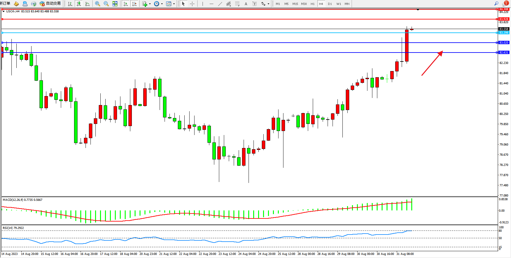 原油维持83.558附近震荡,市场对需求的担忧情绪有所降温,俄罗斯方面称不排除10月继续削减石油出口的可能性,沙特有可能会将减产计划延长至10月,短线油价仍有进一步上涨机会。