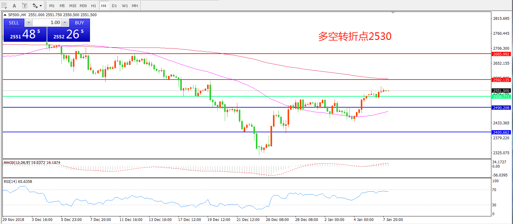 4小时图看,SP500站2490后强势上行,均线系统有拐头迹象,MACD红柱增加,RSI指标出现拐头,短期反弹概率较大。