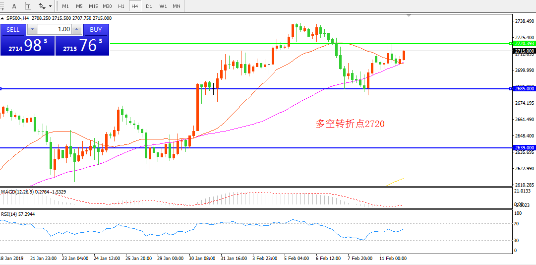 4小时图看,SP500逐渐站稳55周期均线,但短期均线下穿形成死叉。MACD红柱缩短,存在明显回落风险存在。